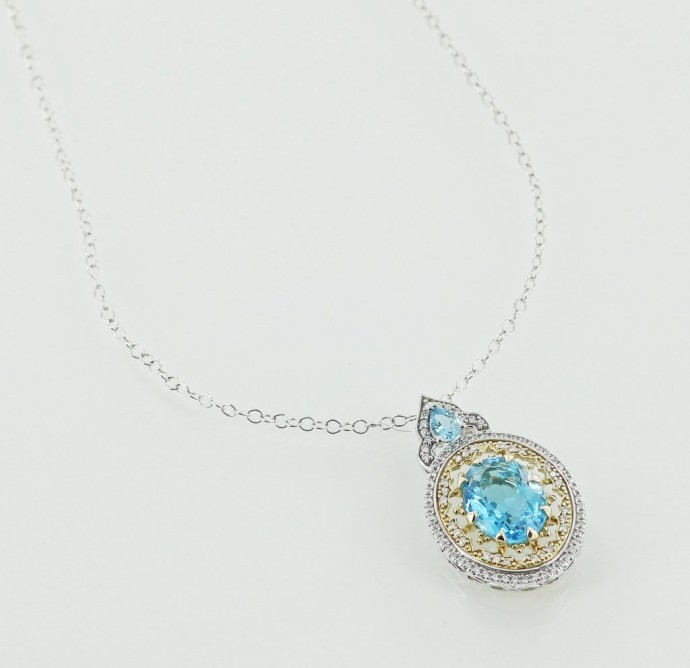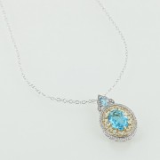 10 Karat white gold chain with 10 karat two-tone 1 large 1 medium blue topaz multi diamond pendant